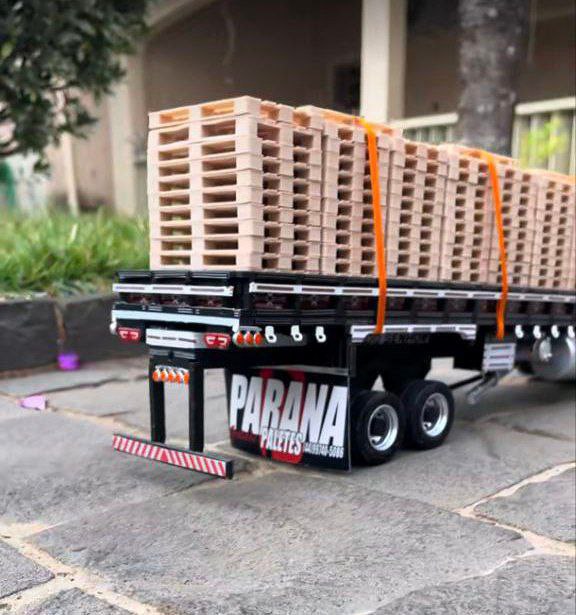 Carreta: Carga seca com pallets em miniatura (fixados com cintas de contenção laranja)